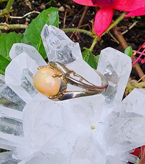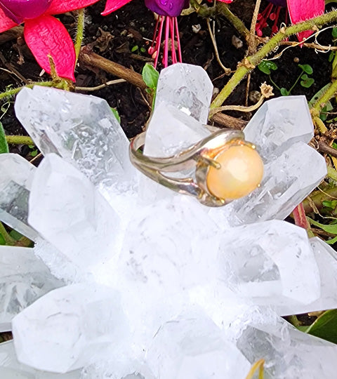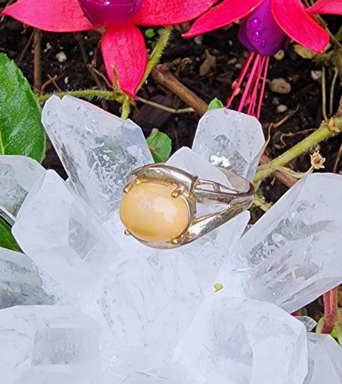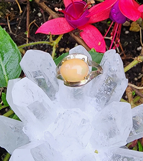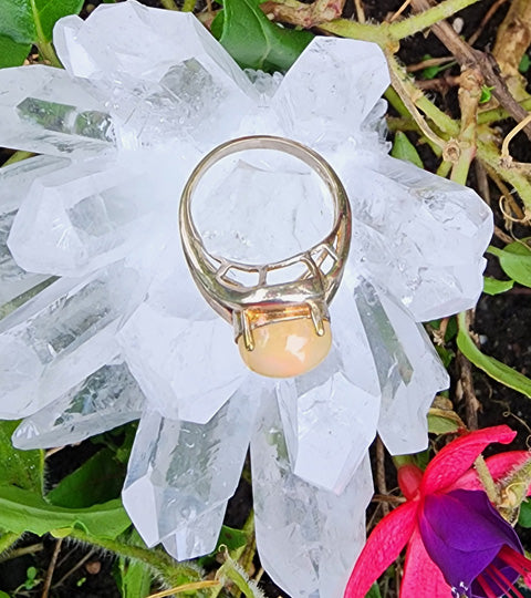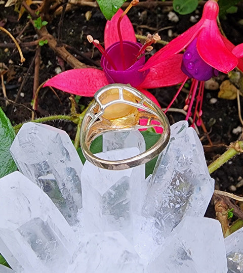 This beautiful opal ring is part of our Timeless Collection. The large cabochon (11 x 9 mm) is a lovely example of a fire opal. In addition to the yellow-orange base colour, it has flashes of colour in yellow, orange, green, and red across the entire surface. The open back makes it clear that this is a solid opal, not a doublet. As usual, the photos struggle to convey the beauty of opals.