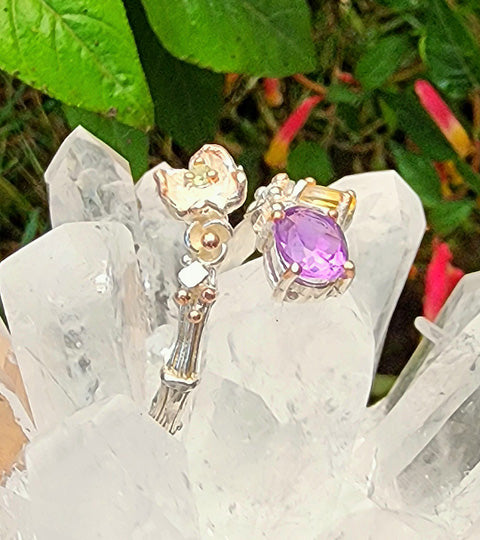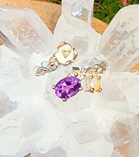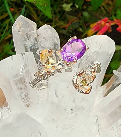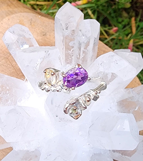This delightful, dainty ring is part of our Rulebreaker Garden Series. In pride of place is a faceted oval amethyst showing great colour and excellent sparkle due to very good gem-cutting. A faceted oval citrine flanks the amethyst. This smaller gemstone has a fantastic glow and complements the amethyst nicely. Opposite these two gemstones is a small faceted green sapphire providing just a hint of green hues to this garden display.