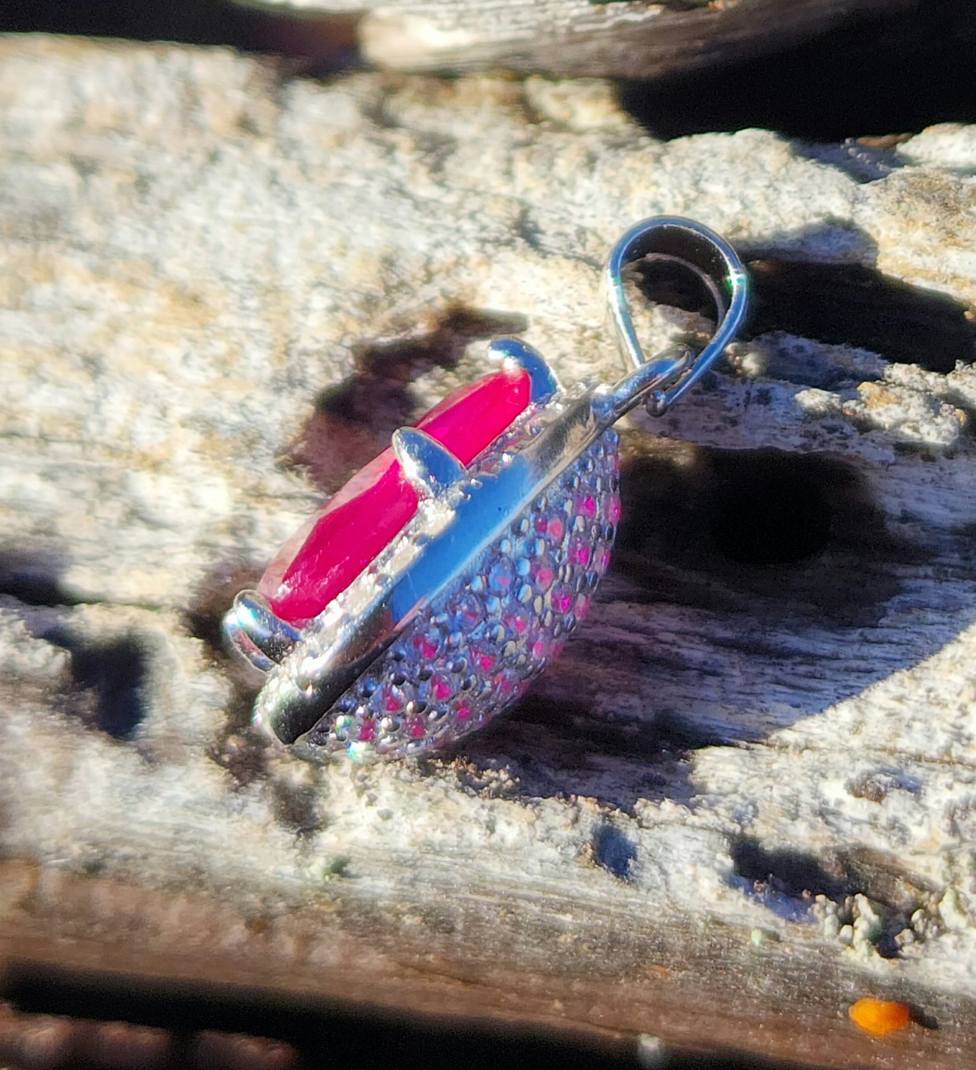 A stunning addition to our timeless collection, this is a pear-cut ruby surrounded by white sapphires. The ruby (a sizable 10 x 7 mm) has a great colour and glow. The sparkling white sapphires in the pavé surrounding it provide great contrast and flash.