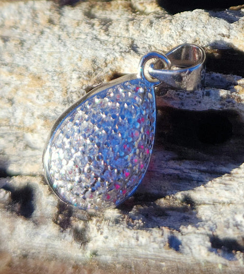 This pendant is reversible since the back is beautifully covered in a pavé of dozens of white sapphires for a completely different look. The setting is sterling silver with a patina of 22-karat white gold to help prevent tarnishing.
