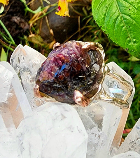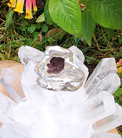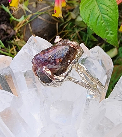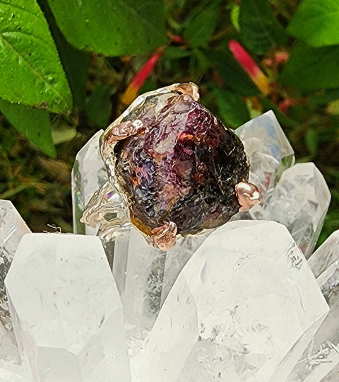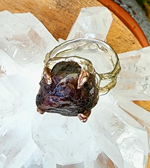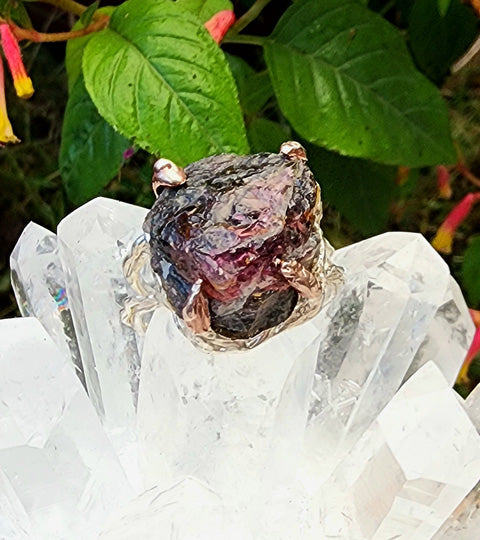 The band is sterling silver with a white-gold patina to help prevent tarnishing and a 22-karat rose-gold patina on the tips of the prongs to complement the pinkish tones of the tourmaline. The band comprises two strands that are intricately textured to resemble bark. Closer together at the base, the strands become slightly farther apart as they reach the gemstone to provide greater stability. The texture provides a lovely complement to the raw gemstone.