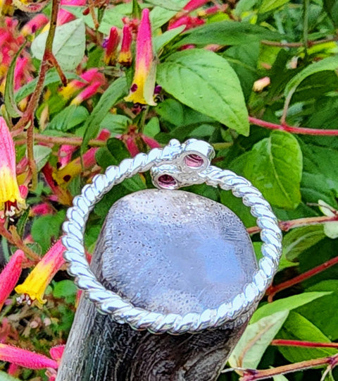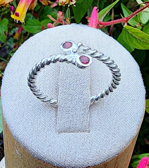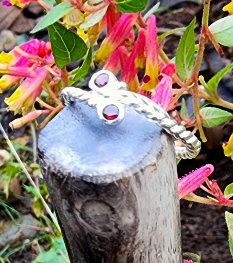 This dainty red garnet ring is part of our Timeless Collection. A twisted sterling silver band adds texture to this delicate piece. The garnets overlap at the top, where the band is soldered to provide stability. A simple, elegant design.