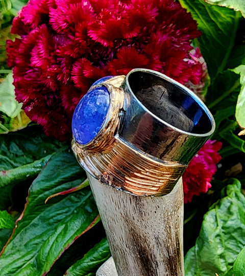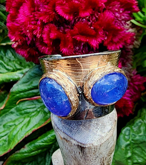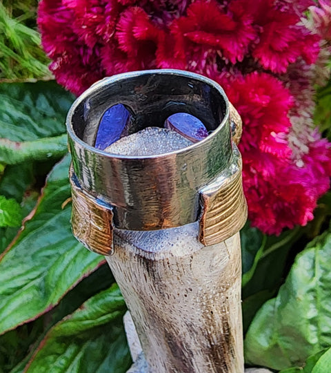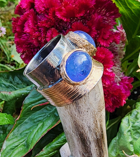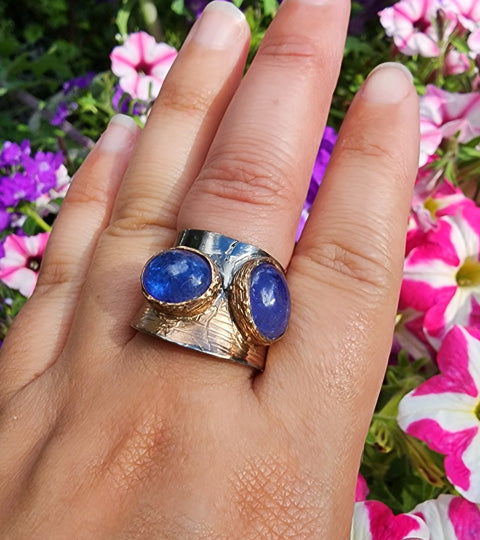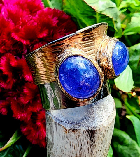 This stunning ring is part of our Ocean Series in our Rulebreaker Collection. The tanzanite gemstones have a deep lilac colour seen on the ocean as the day slides into twilight. These are much larger gemstones than are usually seen in tanzanite. The band is sterling silver with a 22-karat rose gold patina on part and on the bezels. Tanzanite is one of the birthstones for December.