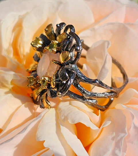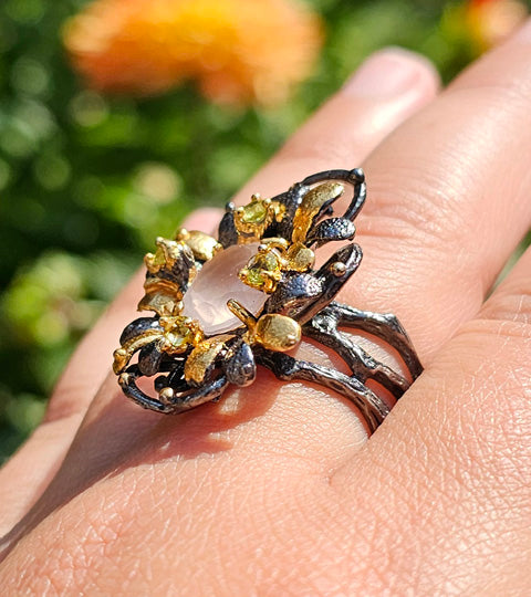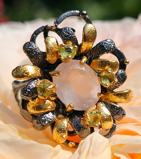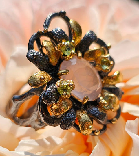This glowing Rulebreaker ring is part of the Garden Series. It comprises a gorgeous faceted rose quartz at the centre of myriad gold and black petals. This type of rose quartz has a very distinctive glimmer and glow to it. Slightly less clear than other types of rose quartz due to the inclusion of very fine golden rutile needles, this addition adds luminosity and depth to the gemstone. A number of curling black loops is suggestive of vines surrounding the flower. Four peridots ring the main gemstone, providing a sparkle of pale green suggestive of leaves.