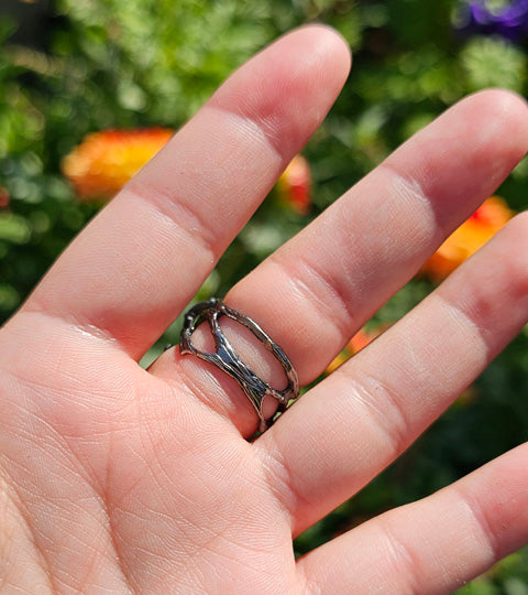 The setting is fine silver with a patina of black rhodium and highlights of 22-karat yellow gold patina to set off the rose quartz. The band itself is formed to suggest twigs and bark and consists of three interconnecting loops to provide great stability and comfort. It also helps prevent sideways slippage of the gemstone on the finger.